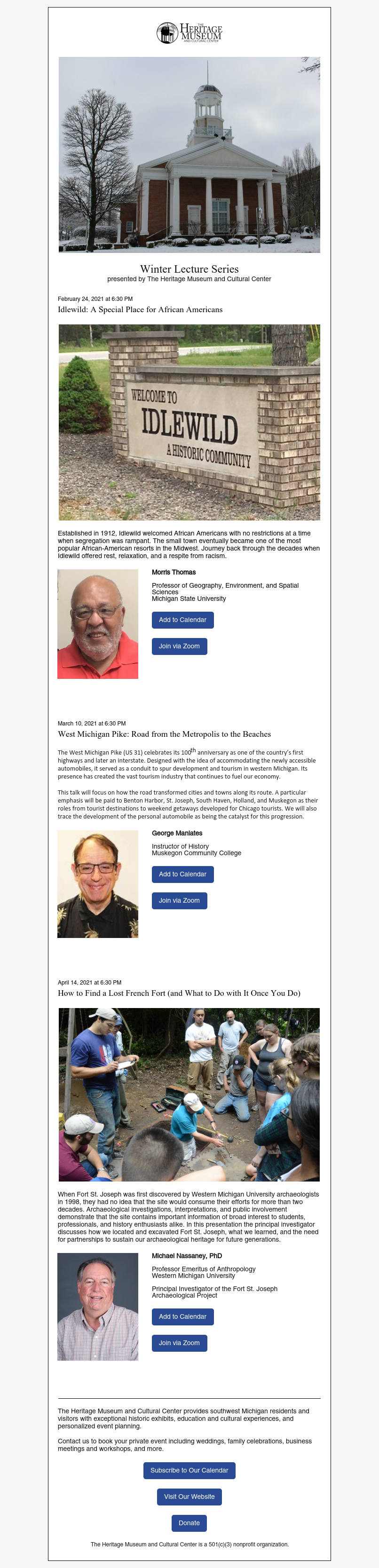 Subscribe and stay informed of upcoming programs and special events at The Heritage.